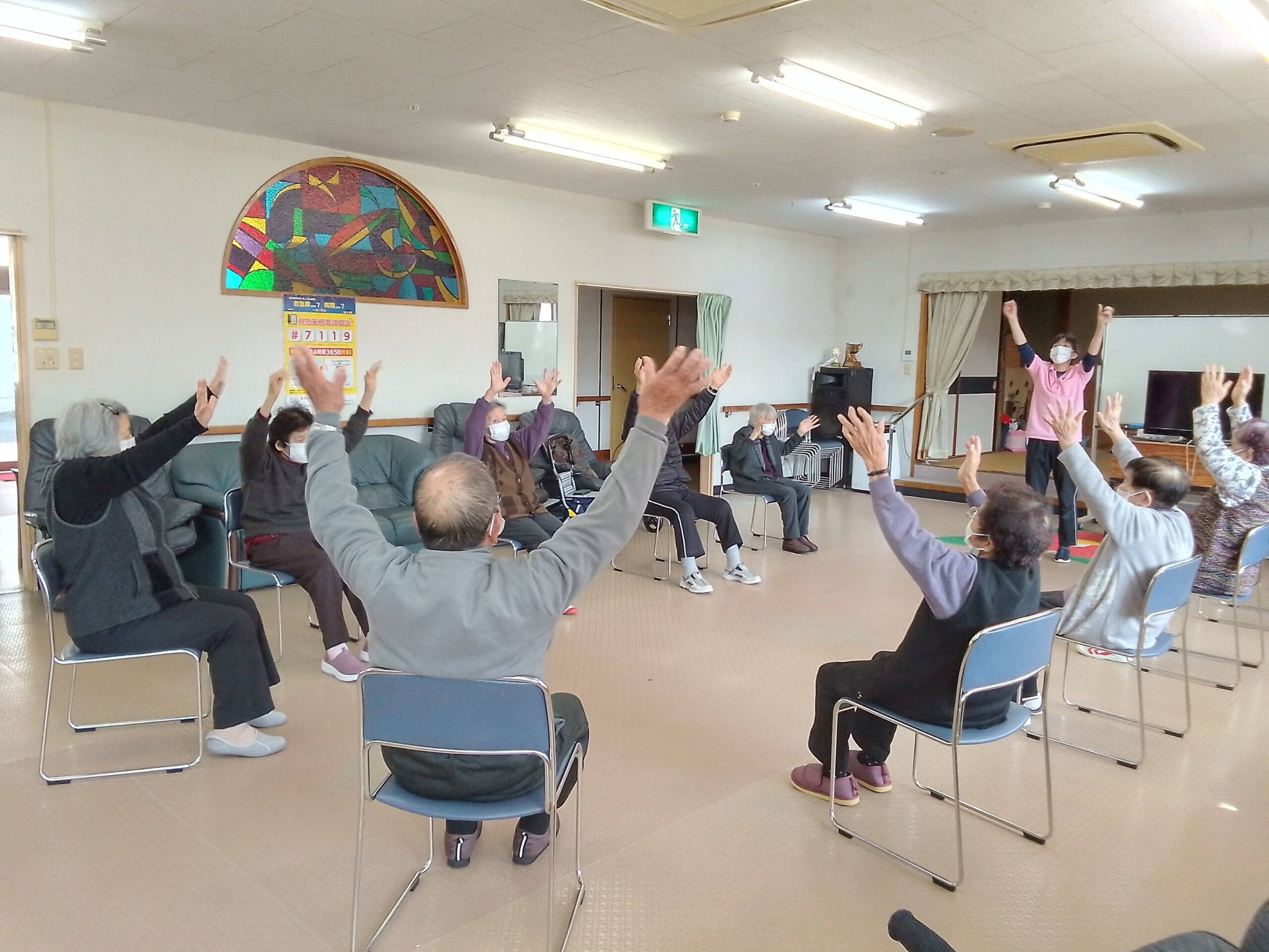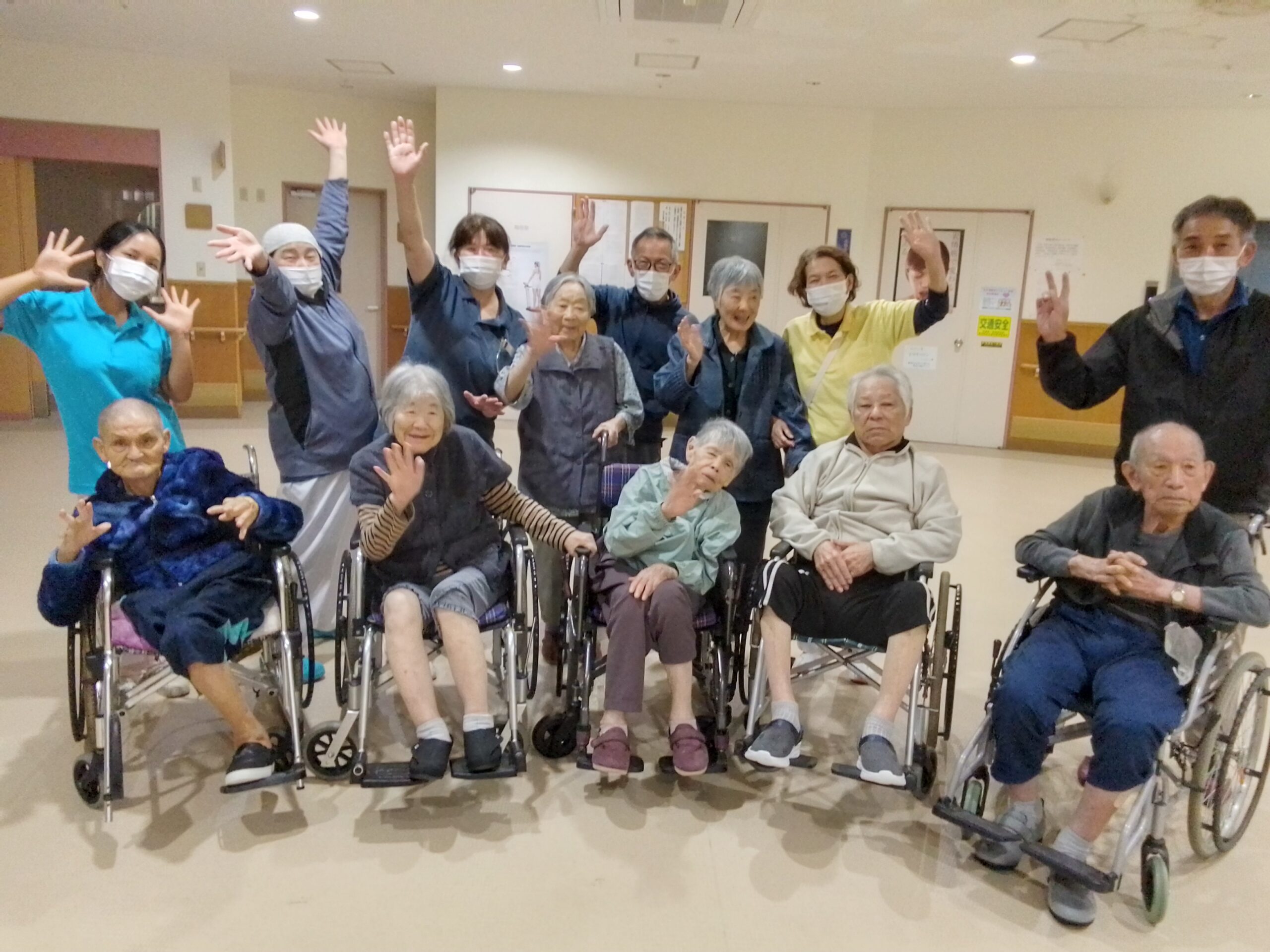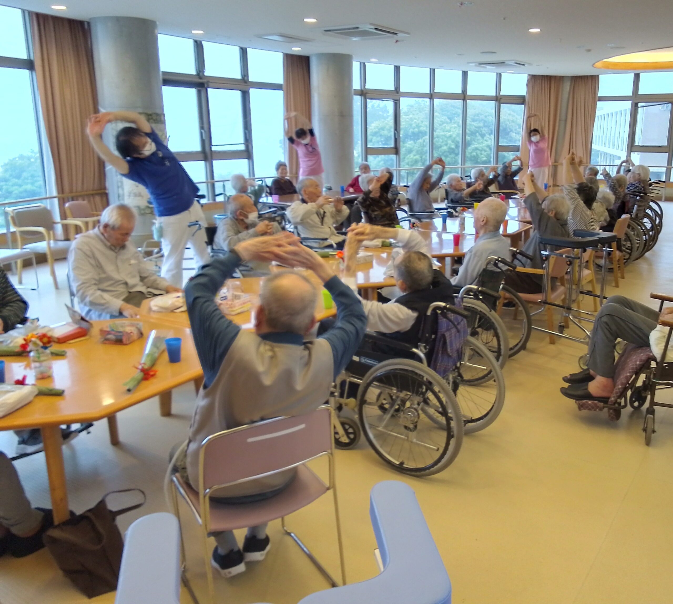 椿ヶ丘荘では、1階に広い地域交流ホールがあり、様々な行事が行われます。行事の他にも、体操や荘庭散歩等もお楽しみいただけます。